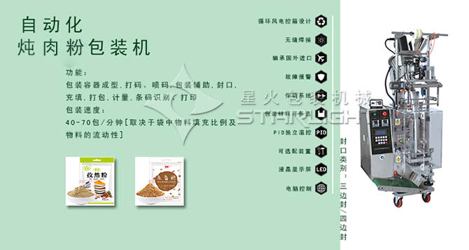 燉肉粉包裝機/燉雞料包裝機廣泛適用于孜然粉、燉肉粉、肉香粉、生姜粉、胡椒粉、花椒粉、小蘇打、玉米淀粉、木薯粉、辣椒粉、椒鹽粉等粉末狀產品的包裝,燉肉粉包裝機的使用能保障包裝過程中不灑漏。