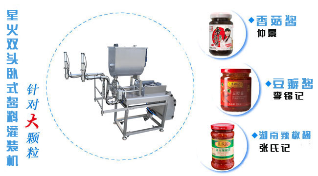 雙頭臥式攪拌灌裝機是星火機械針對醬料攪拌灌裝而最新發展的一種自動灌裝機,具有使用方便、操作簡單、干凈衛生(灌裝頭不滴漏、不噴濺)易維護、精度高等優點,是食品企業醬料灌裝的首選灌裝設備。